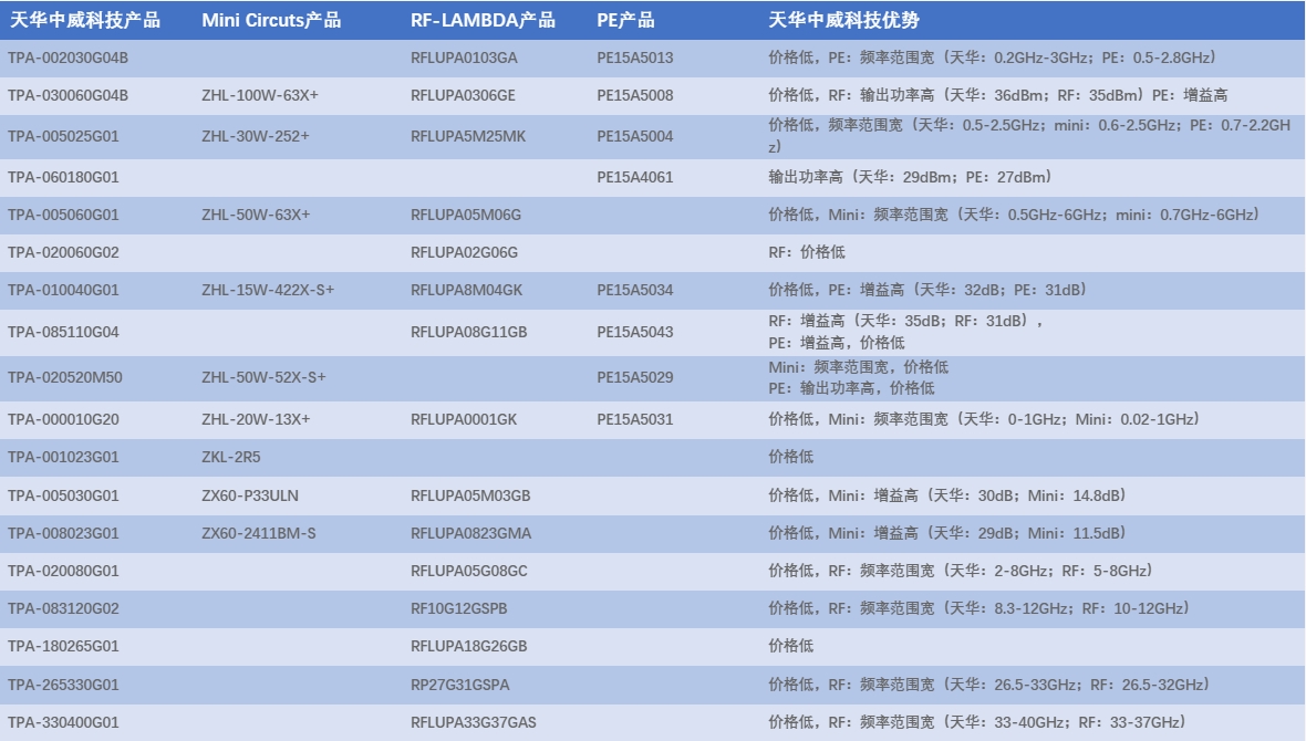 TPA-005025G01ZHL-30W-252+RFLUPA5M25MKPE15A5004价格低,频率范围宽(天华:0.5-2.5GHz;mini:0.6-2.5GHz;PE:0.7-2.2GHz)